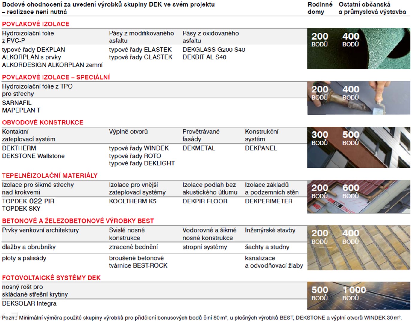 V této sekci jsou uvedeny aktuální přehledy značkových výrobků respektive systémů, které jsou zahrnuty do bodového systému bonusového programu. Podle toho, zda výrobky byly naprojektovány nebo i dodány na stavbu mohou být přiděleny bonusové respektive prémiové body na konto aktivního účastníka programu DEKPARTNER.