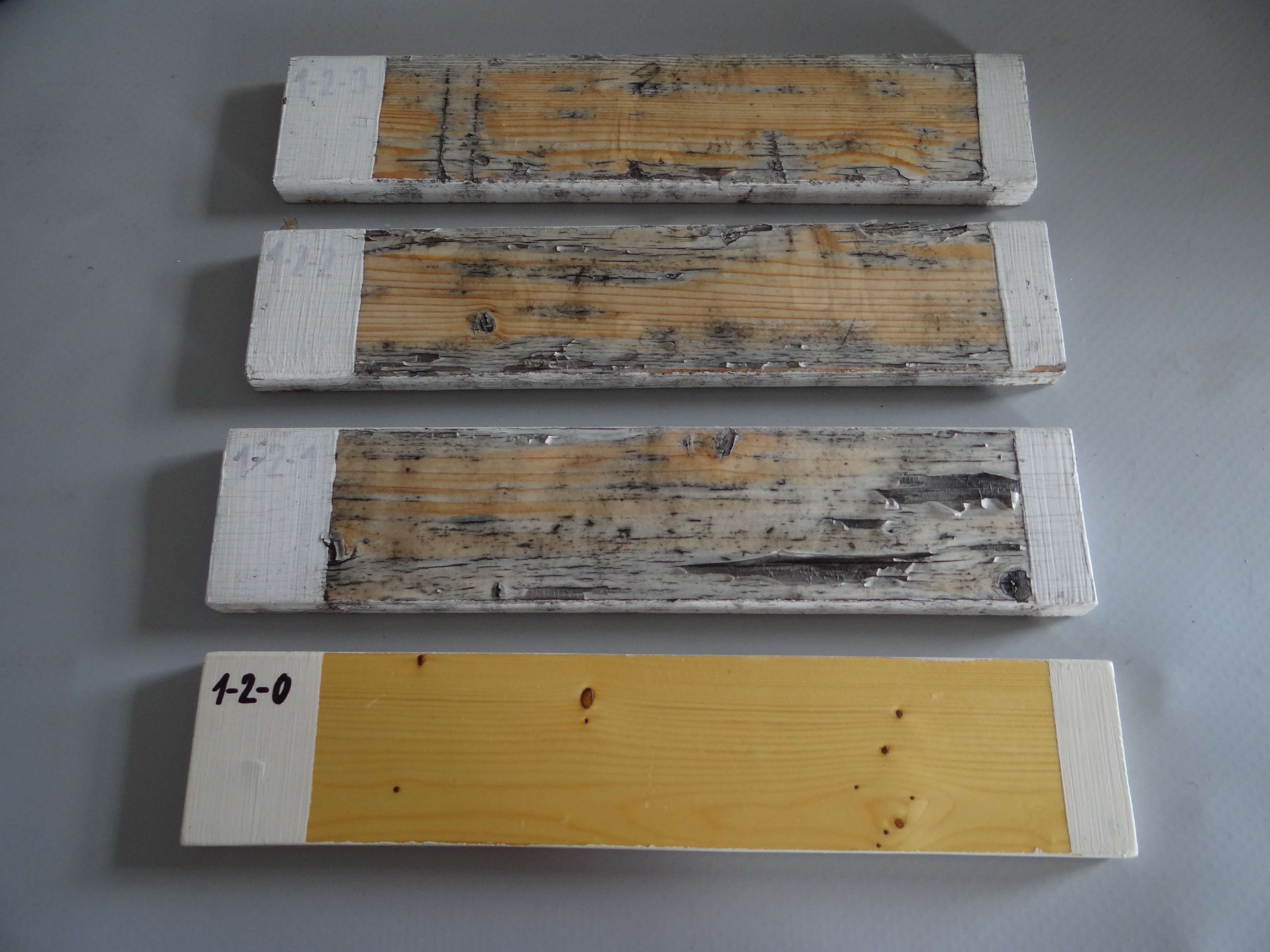 Na fasádě experimentální budovy jsou umístěny vzorky dřevěných obkladů s různými typy nátěrů a několika variantami ošetření podkladu. Testujeme zde barevnou stálost, trvanlivost a účinnost ochrany povrchu. Sledujeme rozdíly mezi nátěry jednotlivých výrobců i způsoby aplikace.