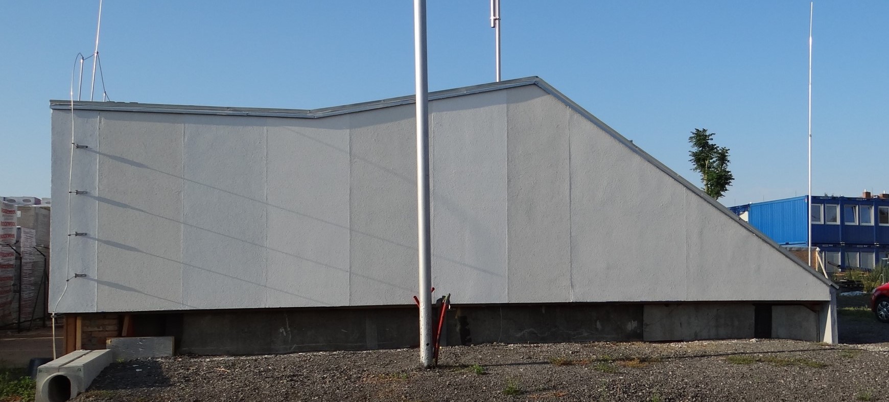 Plochy mají různé sklony: 1°, 12° a 30°, což umožňuje porovnávat jak ploché, tak šikmé střechy. Na stěnových plochách nevytápěné části byly realizovány různé typy fasádních systémů ETICS, podrobněji v kap. Zateplovací systémy .