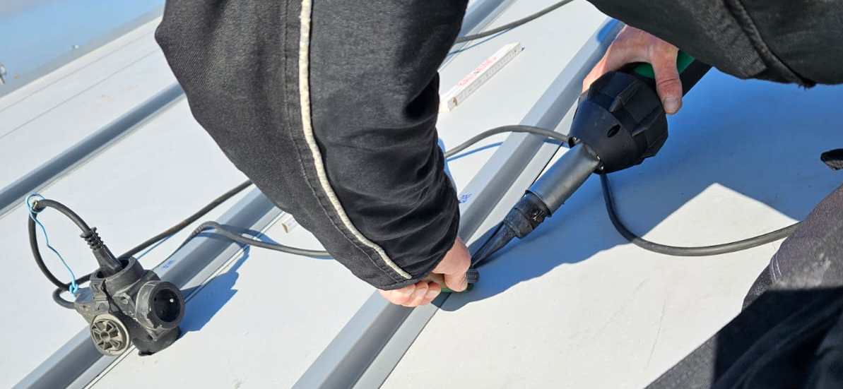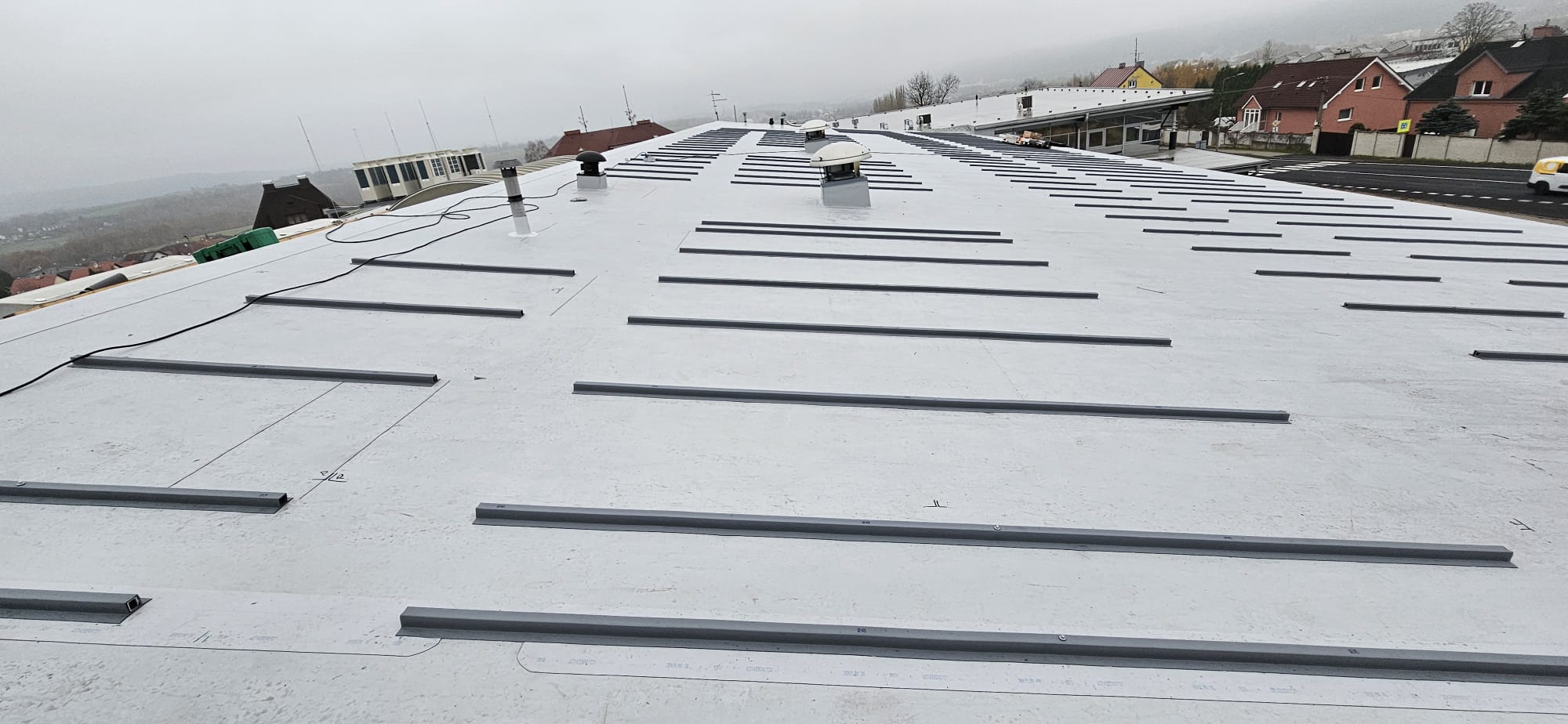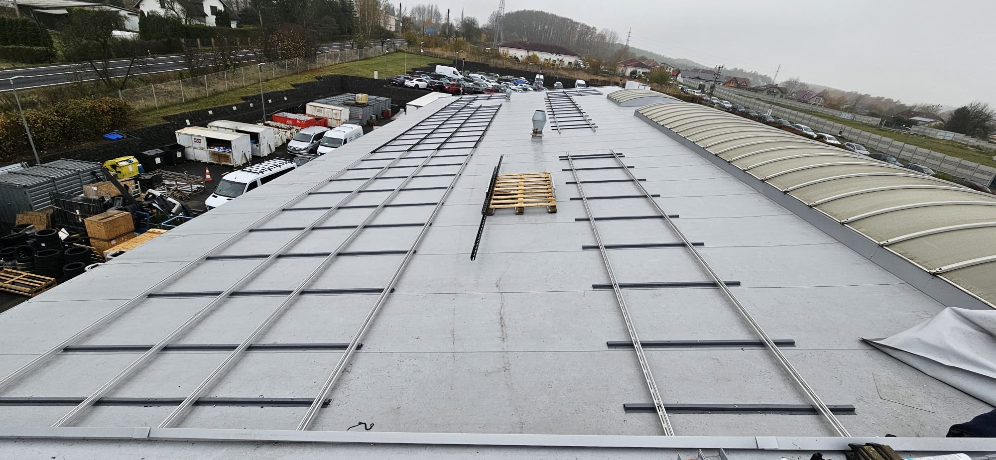 Vzhledem k faktu, že trapézové plechy byly na objektu orientovány rovnoběžně s okapovou hranou, bylo nezbytné klást hydroizolační fólii kolmo k okapu. Tento způsob pokládky nejenže respektoval požadavky na kotvení fólie do jednotlivých vln trapézového plechu, ale současně vytvořil i příznivé podmínky pro budoucí integraci systémového řešení s nosnými profily Alkorsolar. Tyto profily je nutné umísťovat podél spojů hydroizolační fólie tak, aby mohly účinně přenášet mechanické zatížení vznikající vlivem působení větru na instalované fotovoltaické panely a zároveň aby nebránily plynulému odtoku vody ze střechy.
